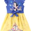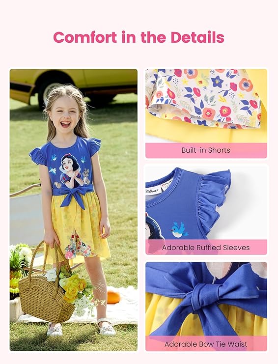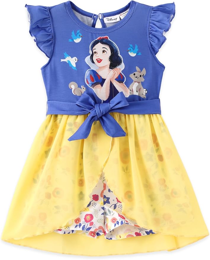 - Disney Officially Licensed: This Disney Princess Snow White jumpsuit features the beloved character Snow White from the Snow White and the Seven Dwarfs series. The blue top showcases Snow White with her signature red lips and bright smile, surrounded by adorable forest animals. The yellow mesh skirt adds a cheerful and vibrant touch. These Disney toddler girl clothes are perfect for little fans of the iconic Disney Princess