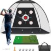 - 【Multi-target Golf Practice Net】10 x 7ft golf net is set with a central target and 4 target pockets , which is carefully designed to improve your accuracy and skills. Our golf hitting net set also comes with a 3-in-1 turf golf mat, 5 golf balls, 1 rubber tee, 1 large-capacity carrying bag and 4 ground stakes. A variety of targets help players focus on all aspects of swinging, chipping, hitting and driving.These are ideal golf accessories for men/women.