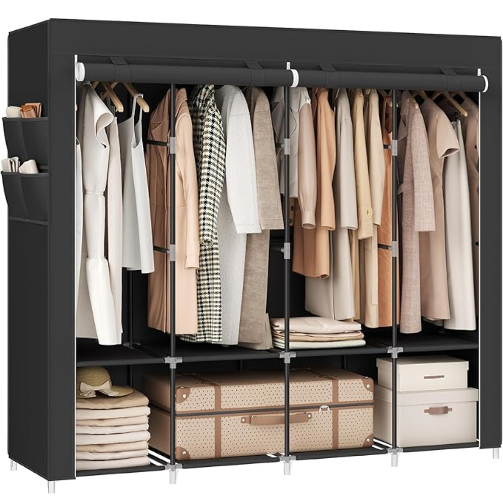 - [What You Get] A portable wardrobe with 4 hanging sections and 4 side pockets that keep your clothes organized, an anti-tip kit for safety, and an easy assembly process with clear instructions