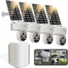 - 【Solar Powered Cameras Easy install 】This kits comes with 4 solar powered outdoor camera. And the 4 cameras already pre match up to the base station, you just need to connect lan to based station, scan QR code on home base, then turn on camera, then you could liveview successfully. One time hoop up, then 4 cameras image come out. The based station support max 128G SD card. All videos could be saved in based station SD card, no need 4 SD card. The camera is solar powered, no need cable, easy to move camera to where to you want to, and also look good.